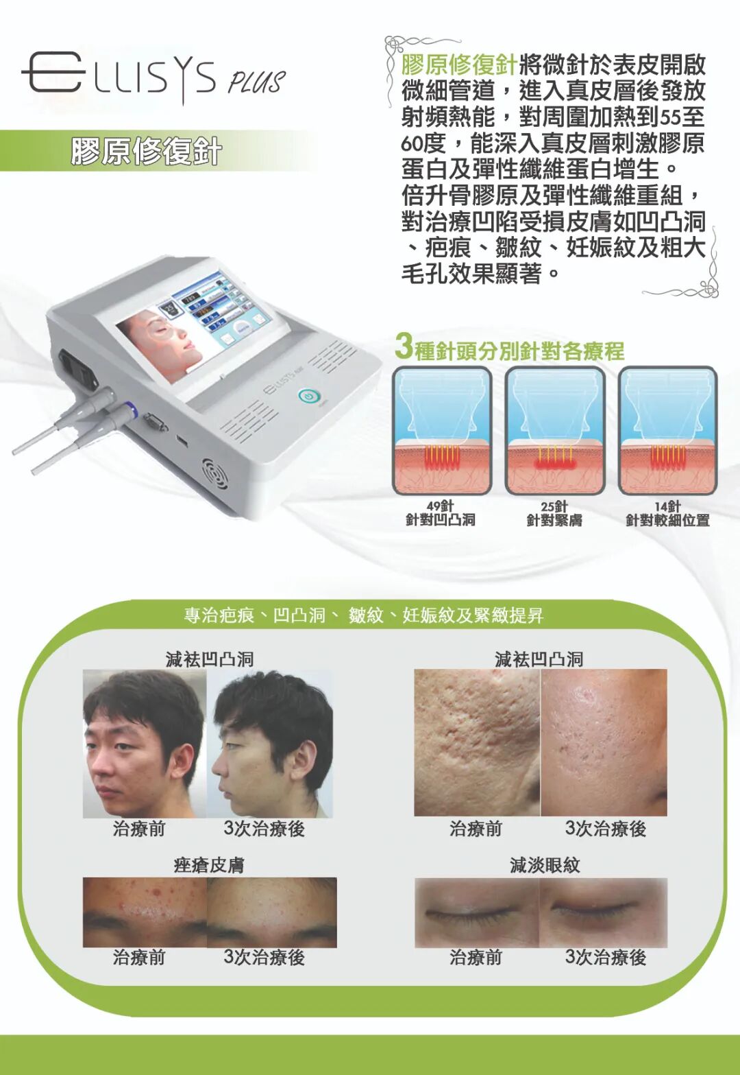 韓國Ellisys Plus微針射頻將微針於表皮開啟微細管道,進入真皮層後發放射頻熱能至55-60°,以刺激膠原蛋白及彈性纖維蛋白增生,從而撫平皺紋、改善凹凸洞及皺褶型黑眼圈,全方位淡化皮膚粗糙感。儀器使用的鍍金針頭可防止過敏反應,0.3mm的微針直徑有效減少皮膚電阻及疼痛,令療程體驗更為舒適。