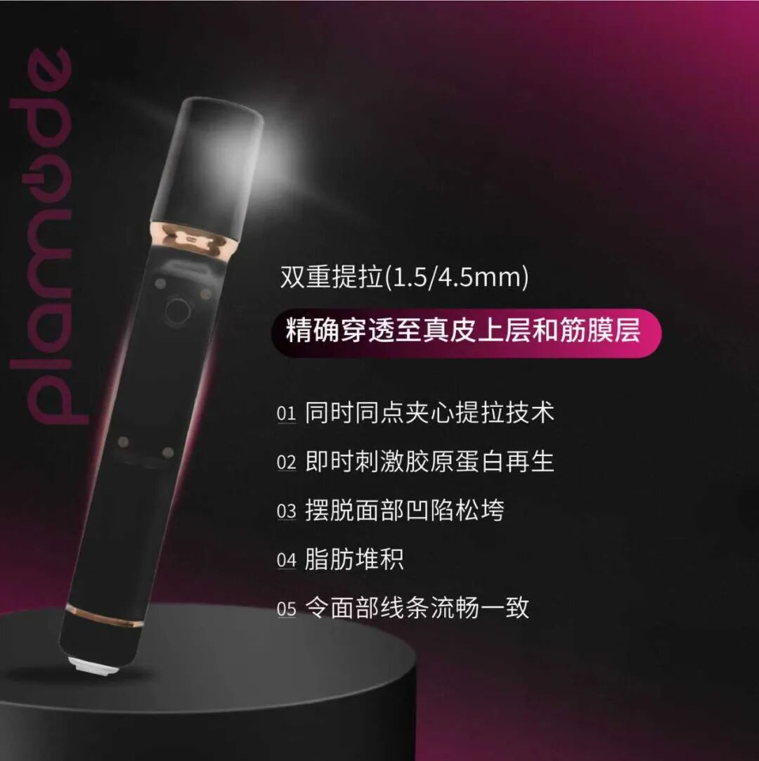 黑金超塑采用韩国专利研发技术,将皮肤吸入设备中发出高频能量和微电流加热底层皮肤,刺激胶原蛋白的生成,强大的能量甚至可以到达脂肪层,可实现了收紧脂肪维度